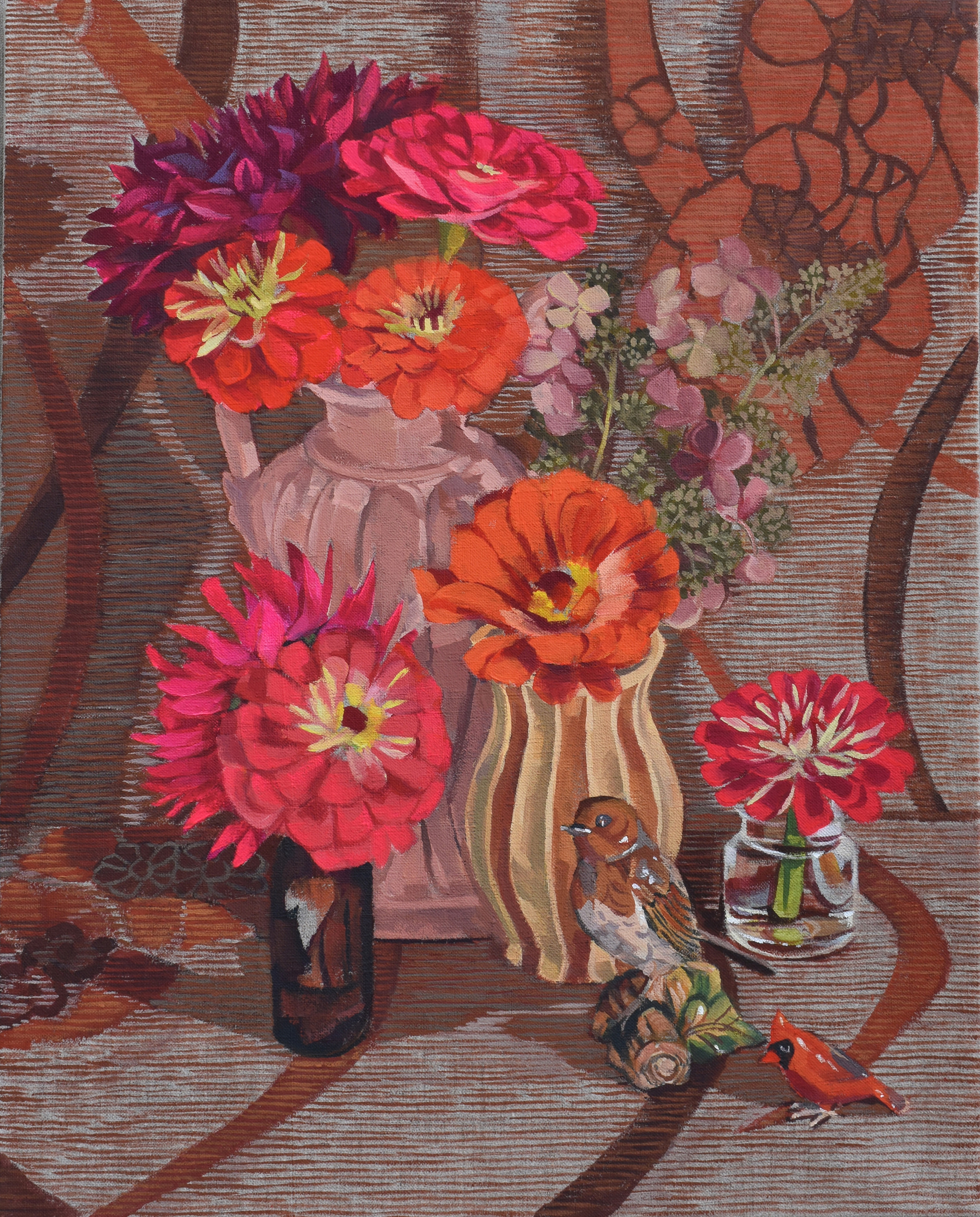 Cardinal and Sparrow With Zinnias